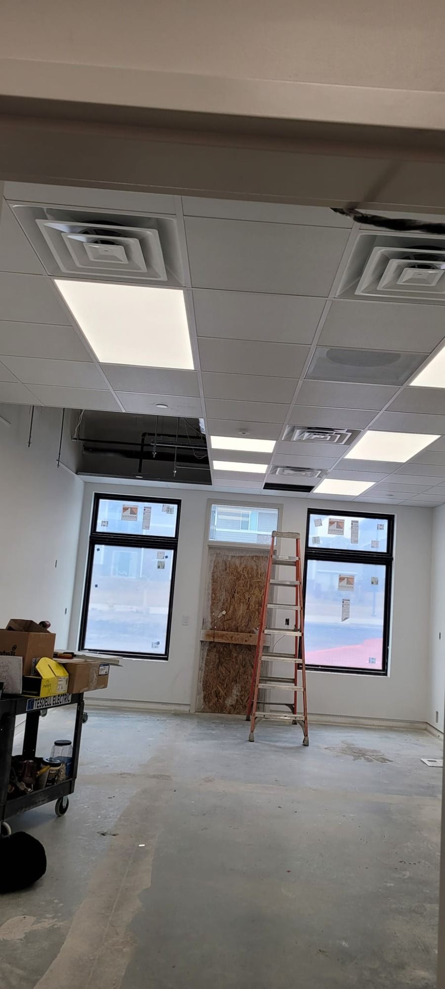 Finishing drywall and four thousand square feet of suspended ceilings in new Laser Lab.